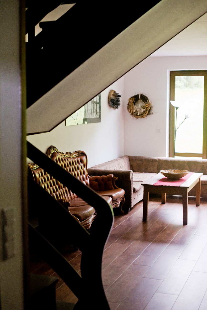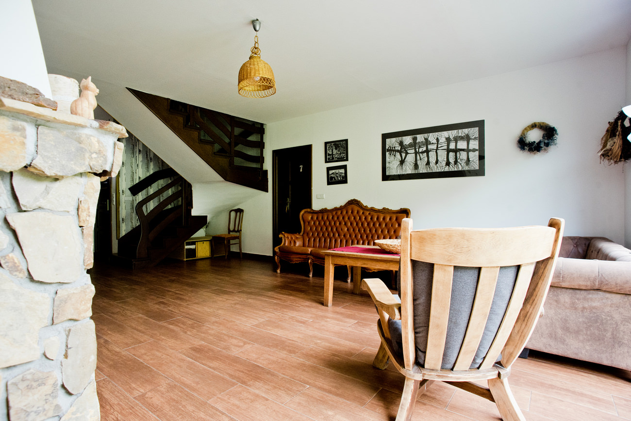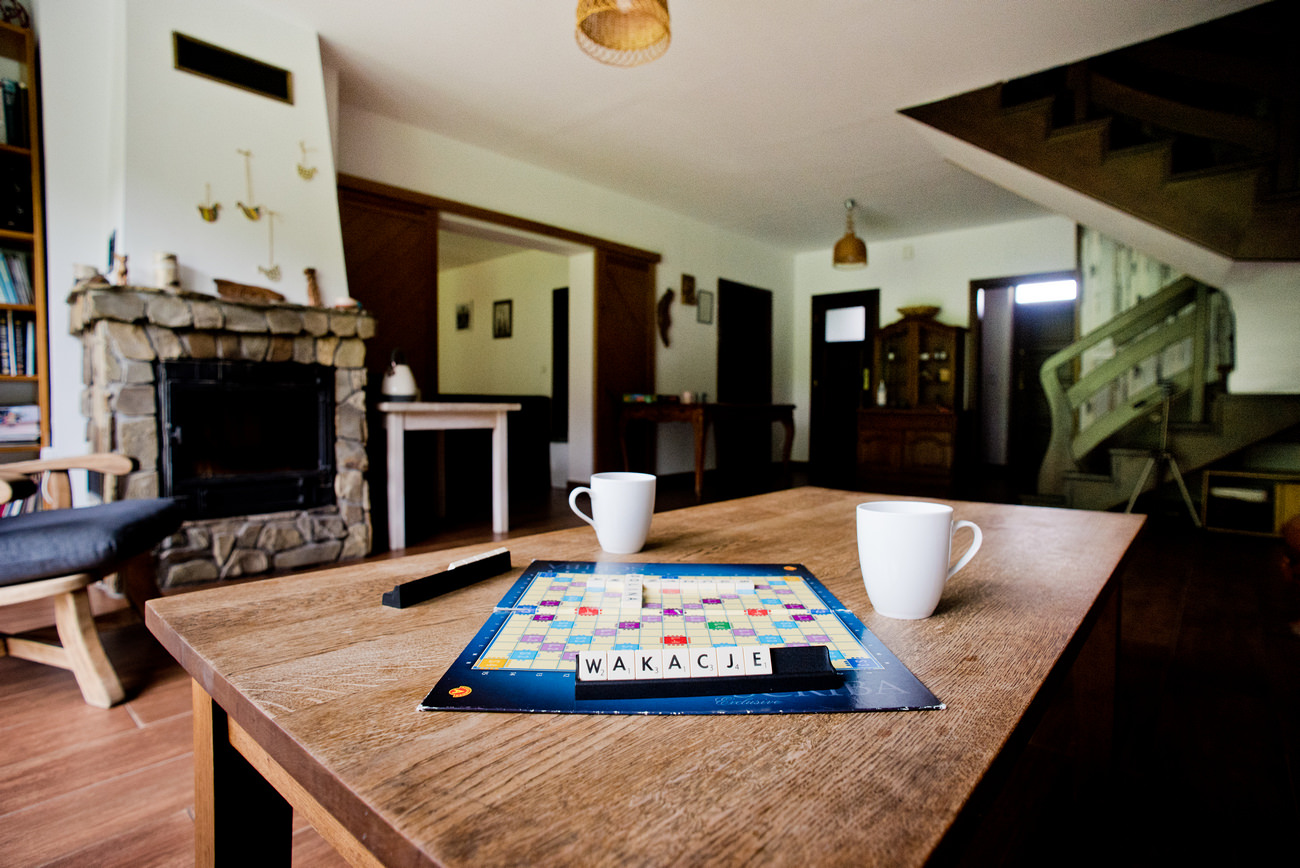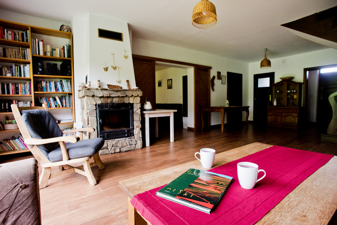 - Na parterze znajduje się salon z kominkiem, biblioteczką i małym aneksem kuchennym (lodówka, czajnik elektryczny)