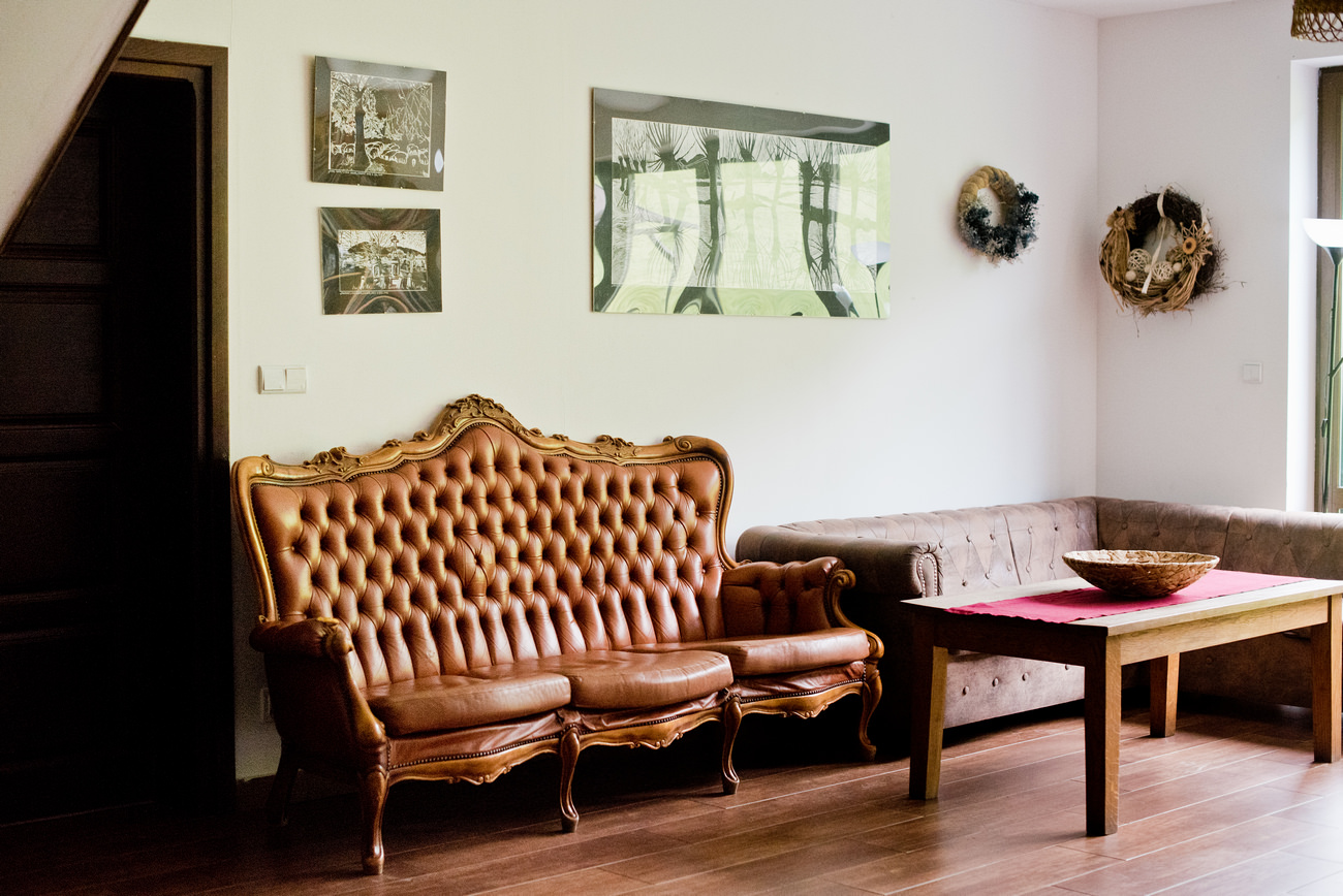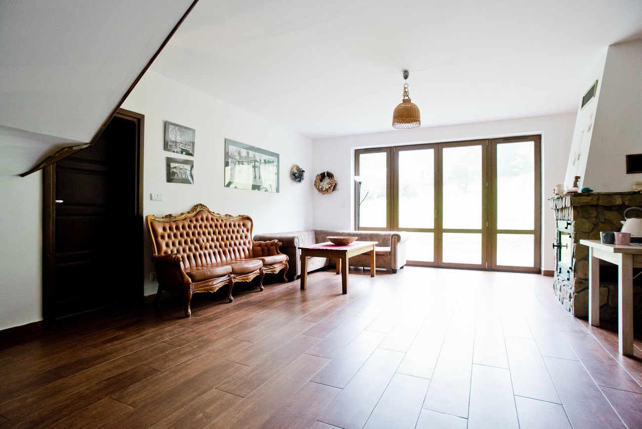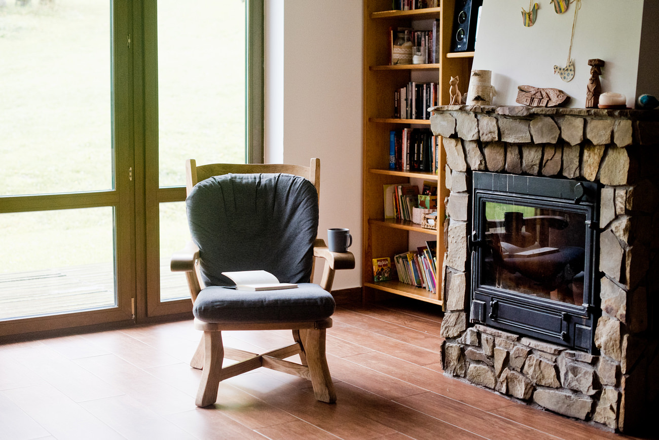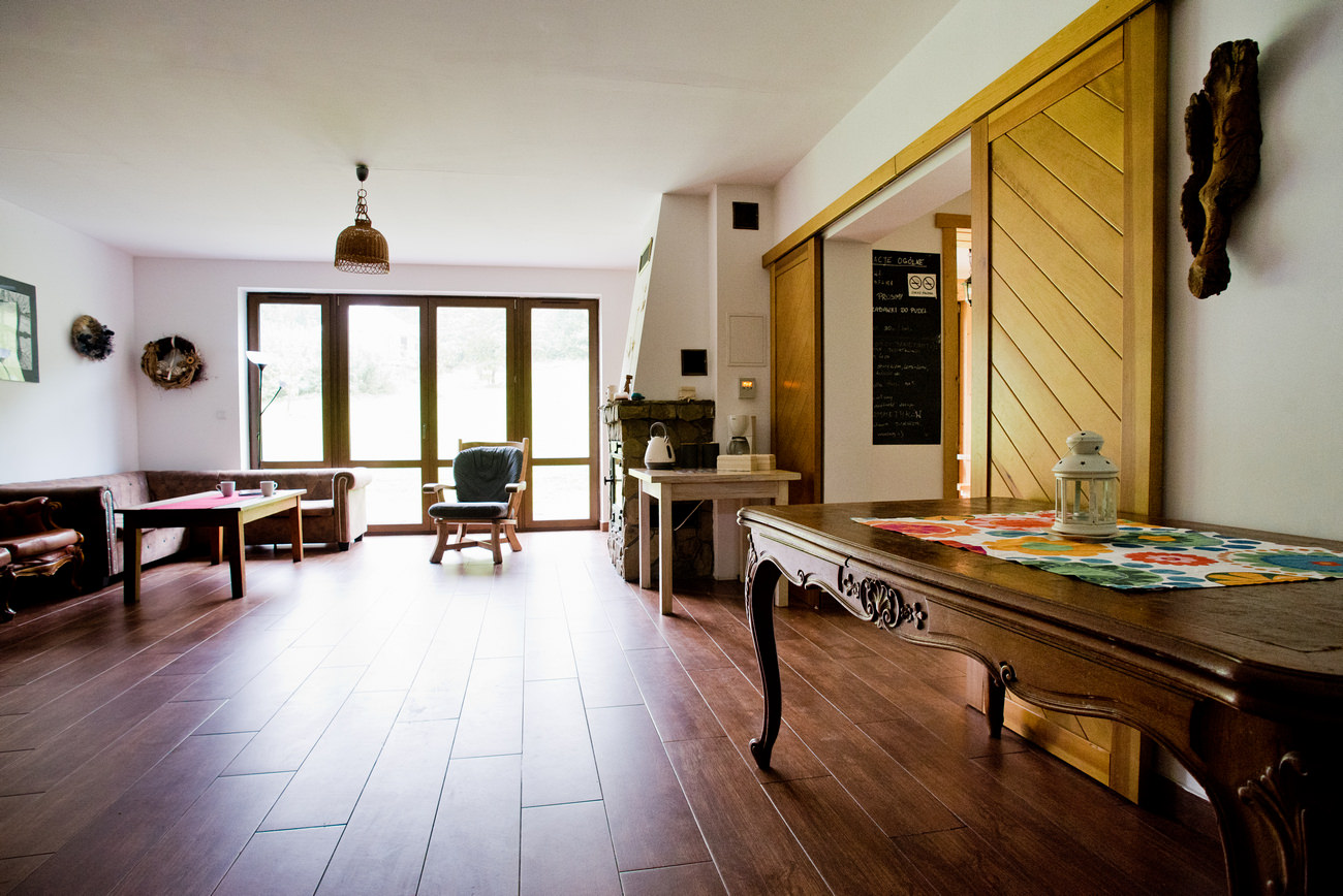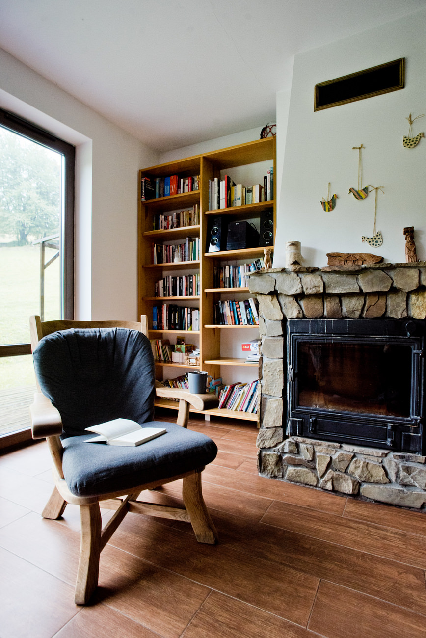 - Na parterze znajduje się salon z kominkiem, biblioteczką i małym aneksem kuchennym (lodówka, czajnik elektryczny)